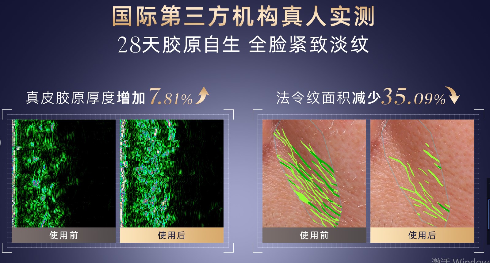 让我们来看看第三方机构通过真人测试得到的具体数据:31 名受试者经过第三方机构检测,测出28天胶原自生的具体数据:真皮胶原厚度增加7.81%,法令纹面积减少35.09%、颈纹体积减少34.75%、抬头纹面积减少19.4%……可见NLC黄金双抗美容仪抗老功效显著。